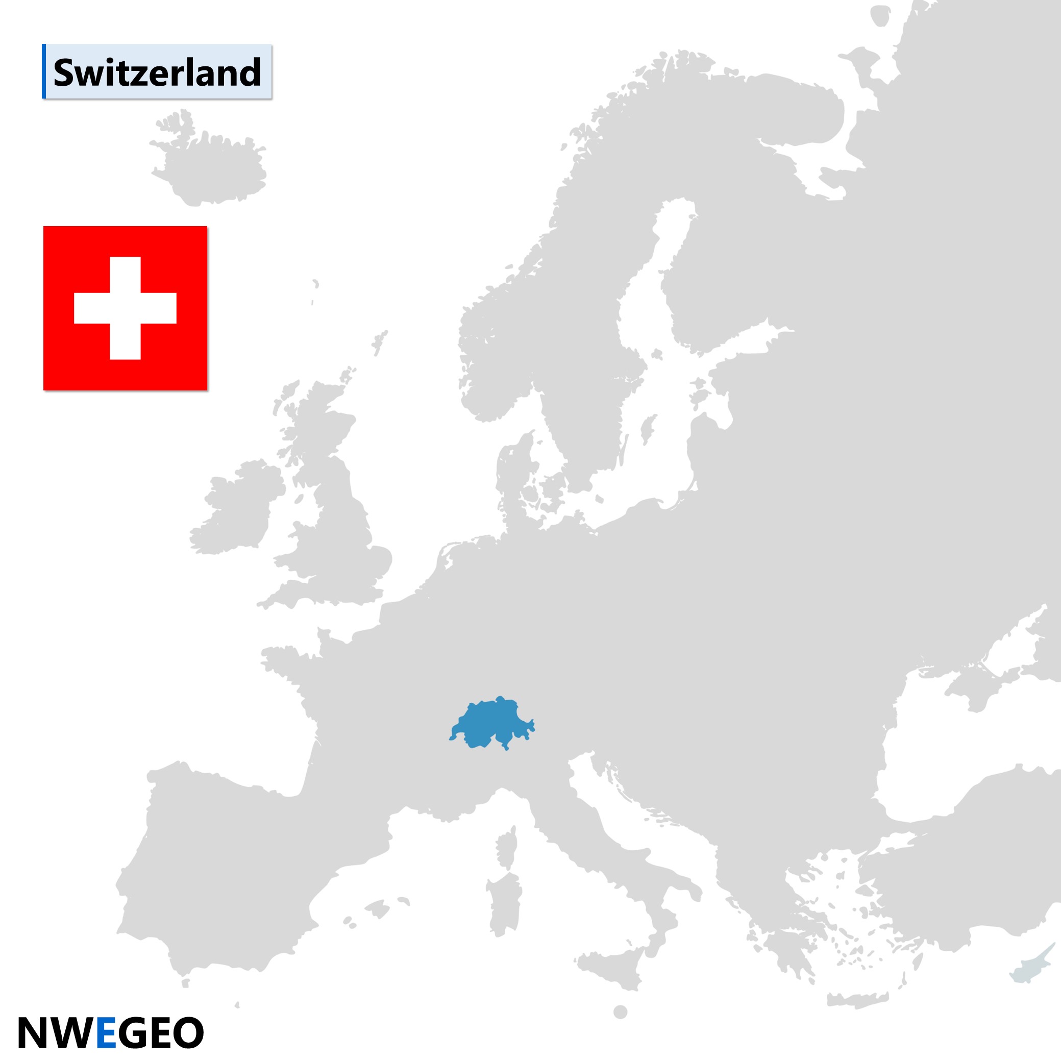 This map of Europe shows the location of Switzerland, and also the flag of the country. Switzerland is located in Western Europe.